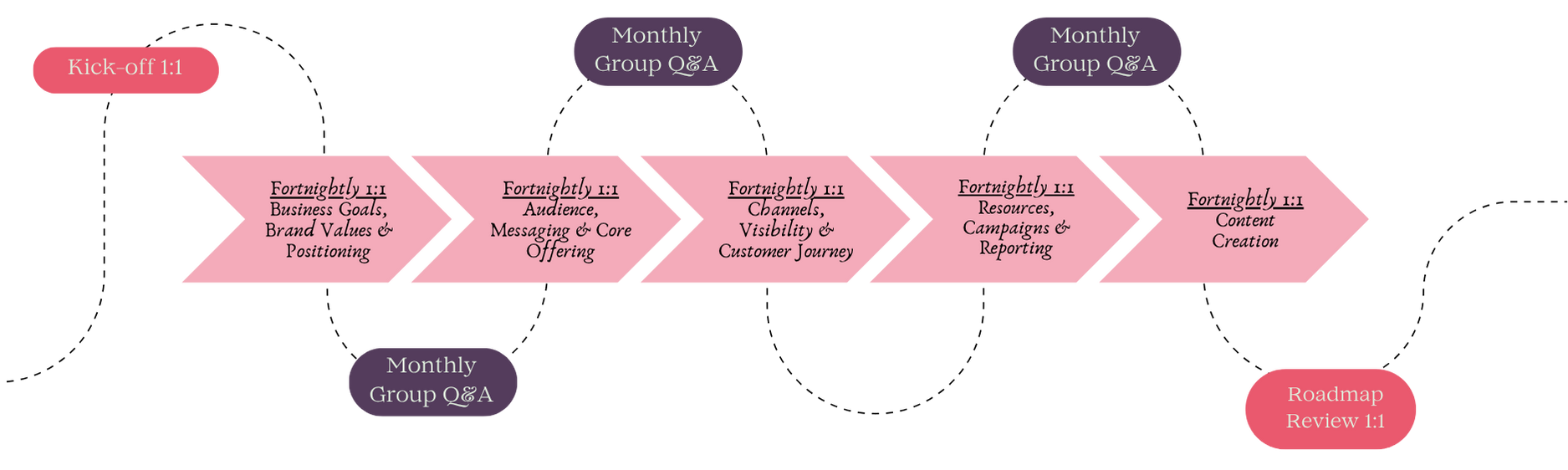 Over the programme, we’ll build your marketing strategy together, week by week. You’ll learn how to think like a marketer, make confident decisions, and create a plan that actually works for your business.